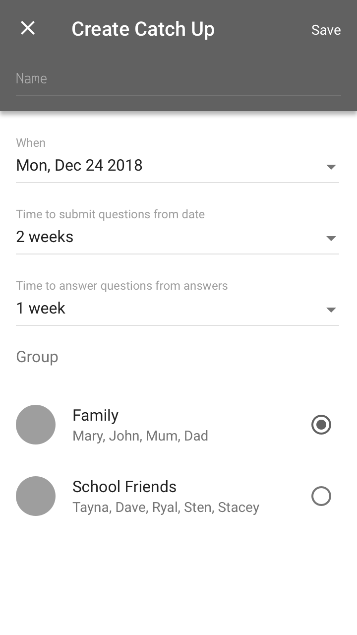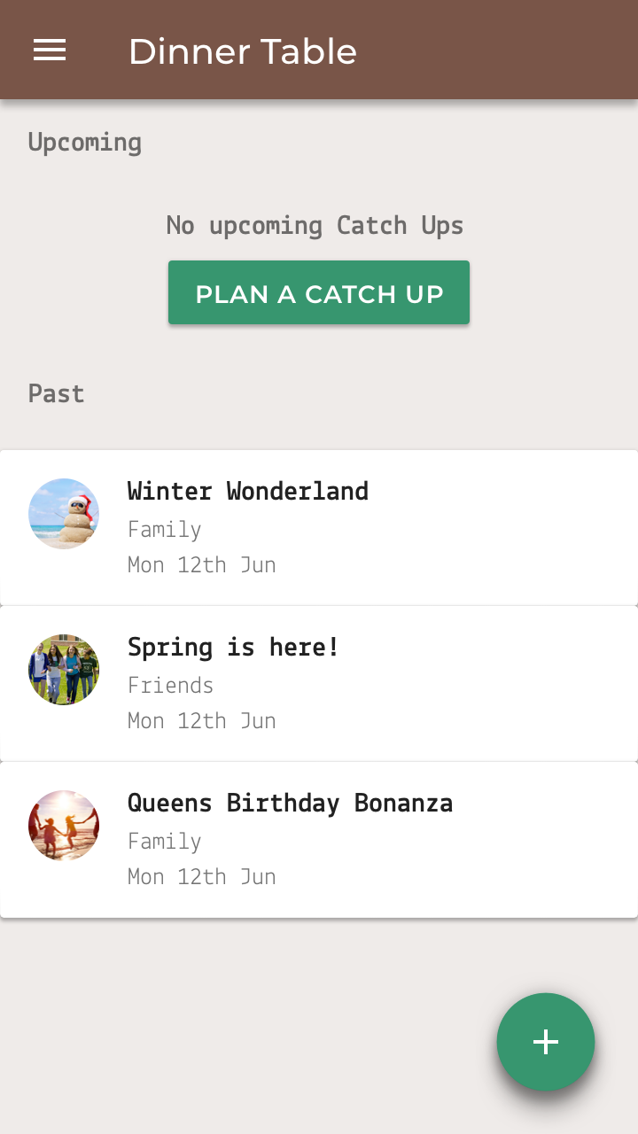 Task Scenario: You have no upcoming catch ups organised with your family. Create a new Catch Up event and save it.