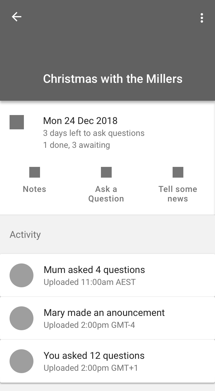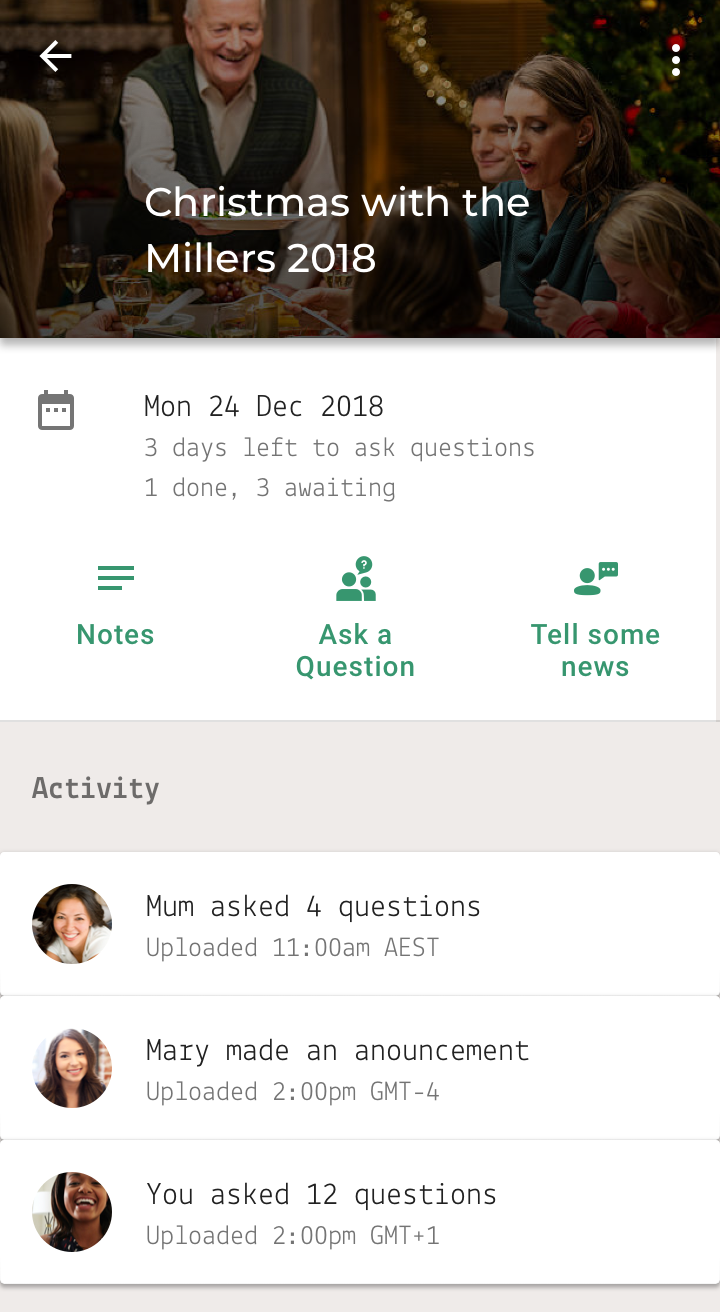 Dinner Table makes it easy to catch up family or friends that are restricted by time zone and geographical boundaries. In its simplest form, the features allow users to connect, start group conversations, note down questions on the run, record questions and answers, and stitch them all together into one amazing dinner table video catch up. This can all be done in the convenience of your own time to tackle time zone and geographical boundaries.