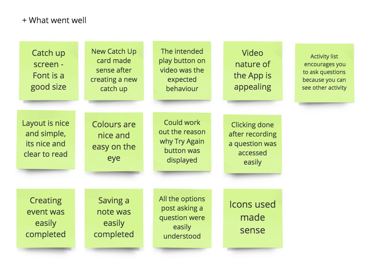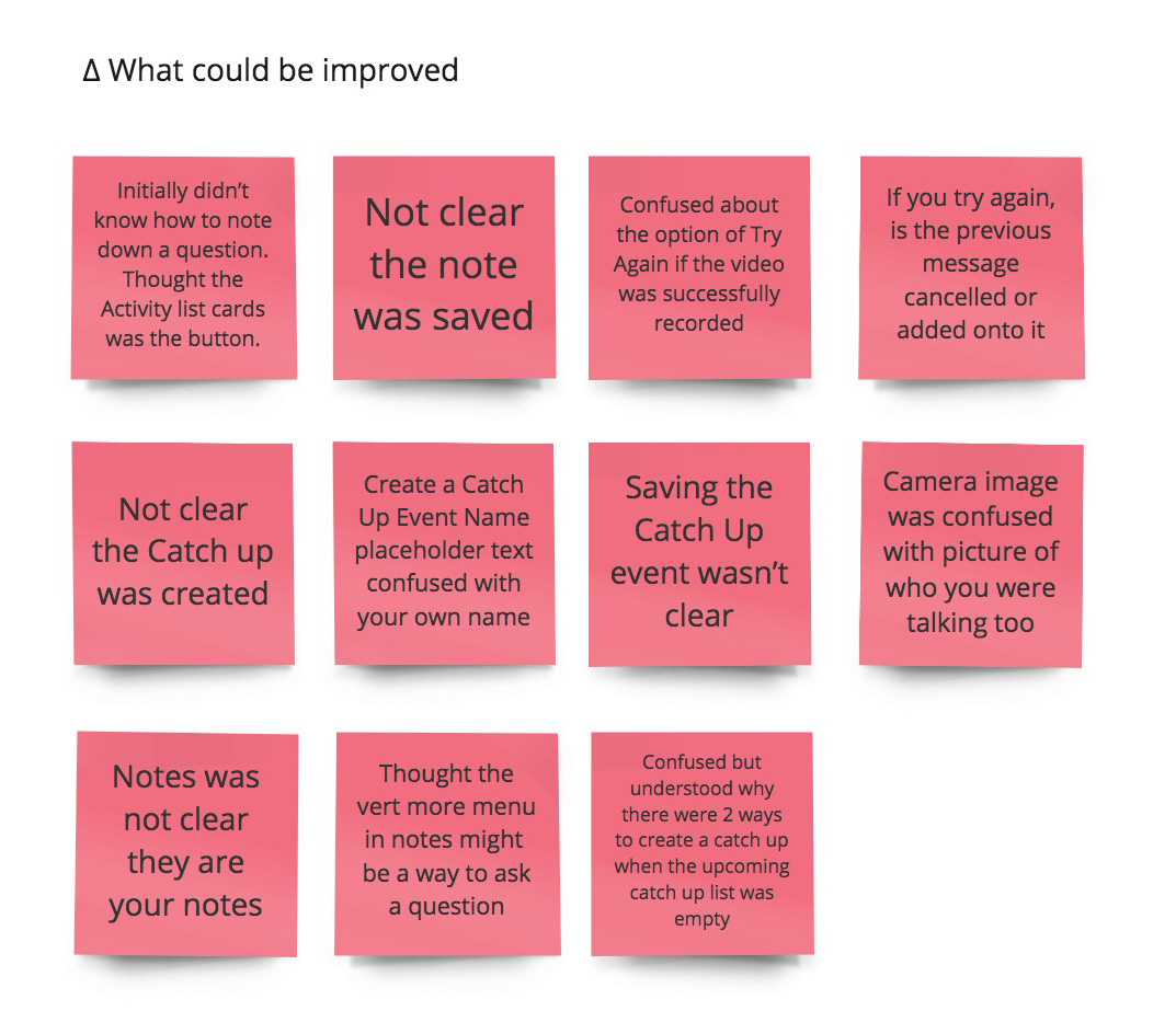 Need more user feedback once an event/note/question was created or saved. “Name” placeholder for Creating a Catch Up was confused with it being for your own name. I don’t believe the purpose of Notes was understood.