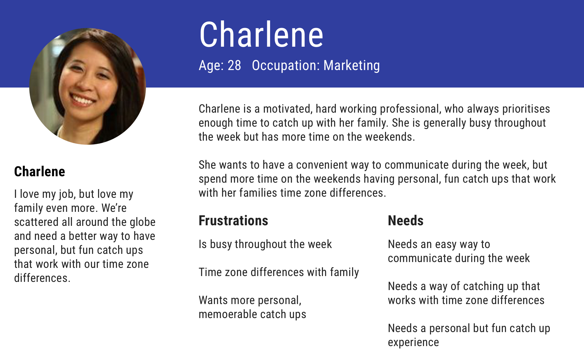 Meet Charlene. She wants to have a convenient way to communicate during the week, but spend more time on the weekends having personal, fun catch ups that work with her families time zone differences.